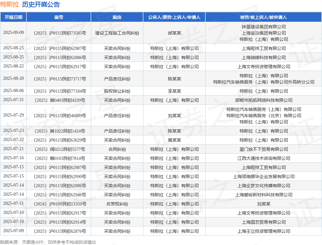 案号:(2025)沪0115民初63029号审理法院:上海市浦东新区人民法院案由:买卖合同纠纷当事人信息: 原告/上诉人:黄某某 被告/被上诉人:特斯拉(上海)有限公司开庭日期:2025年7月22日根据统计,近一年内以特斯拉(上海)有限公司为当事人的历史开庭公告有205则,其中案由为“买卖合同纠纷”的公告以138则居首,其次为“合同纠纷”有10则,“追偿权纠纷”有7则。历史开庭公告(前20条)如下:
