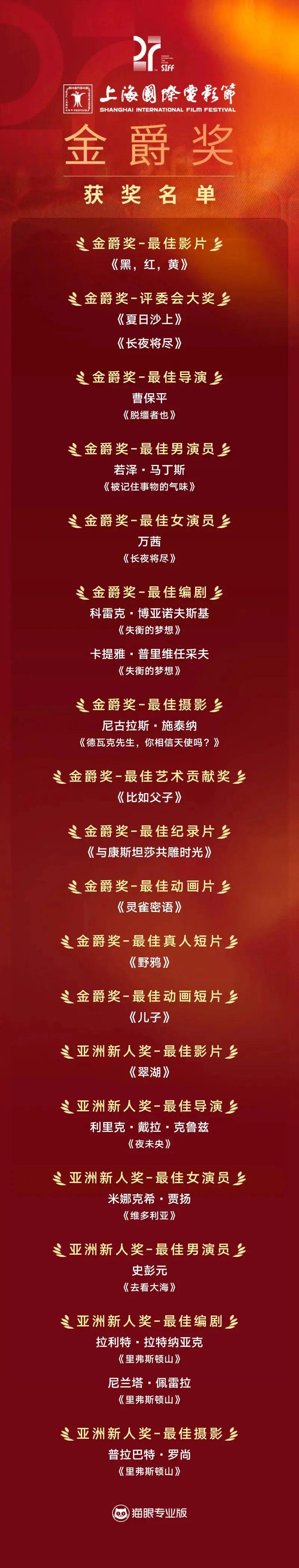 看完颁奖典礼再来看获奖名单,恭喜各位获奖者们,希望他们继续带来更好的电影作品!