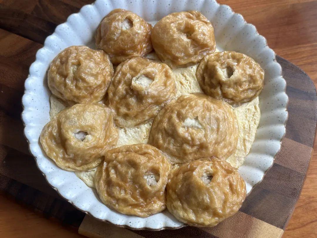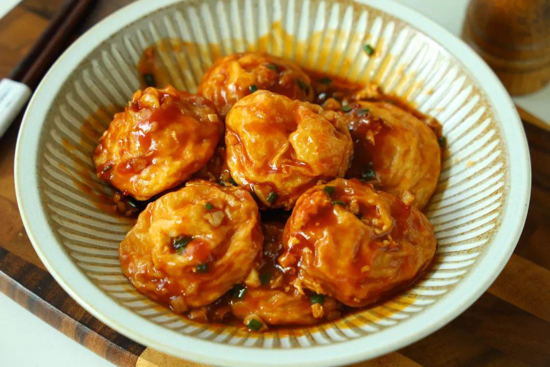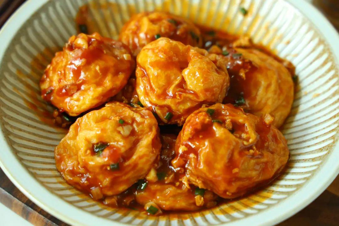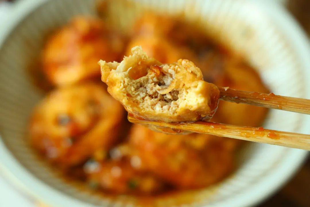 这道菜的巧思,正在于给那看似平平无奇的油面筋开了个小小洞口,悄悄塞进了肉末与鸡蛋这对黄金CP。蒸锅到炒锅的变身,让油面筋吸足了酱汁的精华,却依然守住自身筋骨,成就了这外韧内软的独特口感。更绝的是它那“冷热皆宜”的好脾气,即使放凉了,油面筋的柔韧嚼劲反而更加清晰,裹着凝固的内馅和酱汁,味道竟毫不逊色,甚至别有风味,匆忙的清晨或深夜加餐,随手拈起一个,便是一口心满意足的抚慰。