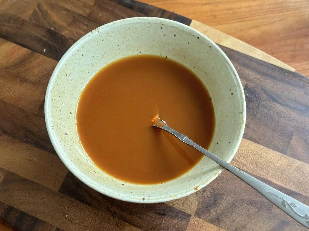 3、再来调个简单的料汁:生抽2勺 老抽半勺 蚝油1勺 番茄酱2勺 淀粉1勺 海盐半勺,把这些调料加在一起,用清水搅拌均匀;
