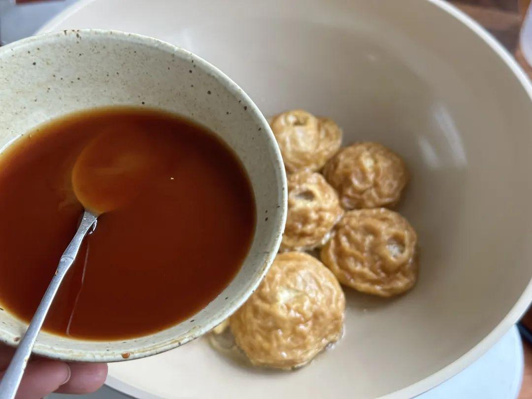 7、这个油面筋这样做真的挺好吃的,油面筋是非常有嚼劲的口感,里面的肉末和蛋液被油面筋和这个酱汁裹着,真的很好吃!而且它是凉了也好吃的一道菜,强烈推荐给你们试试。