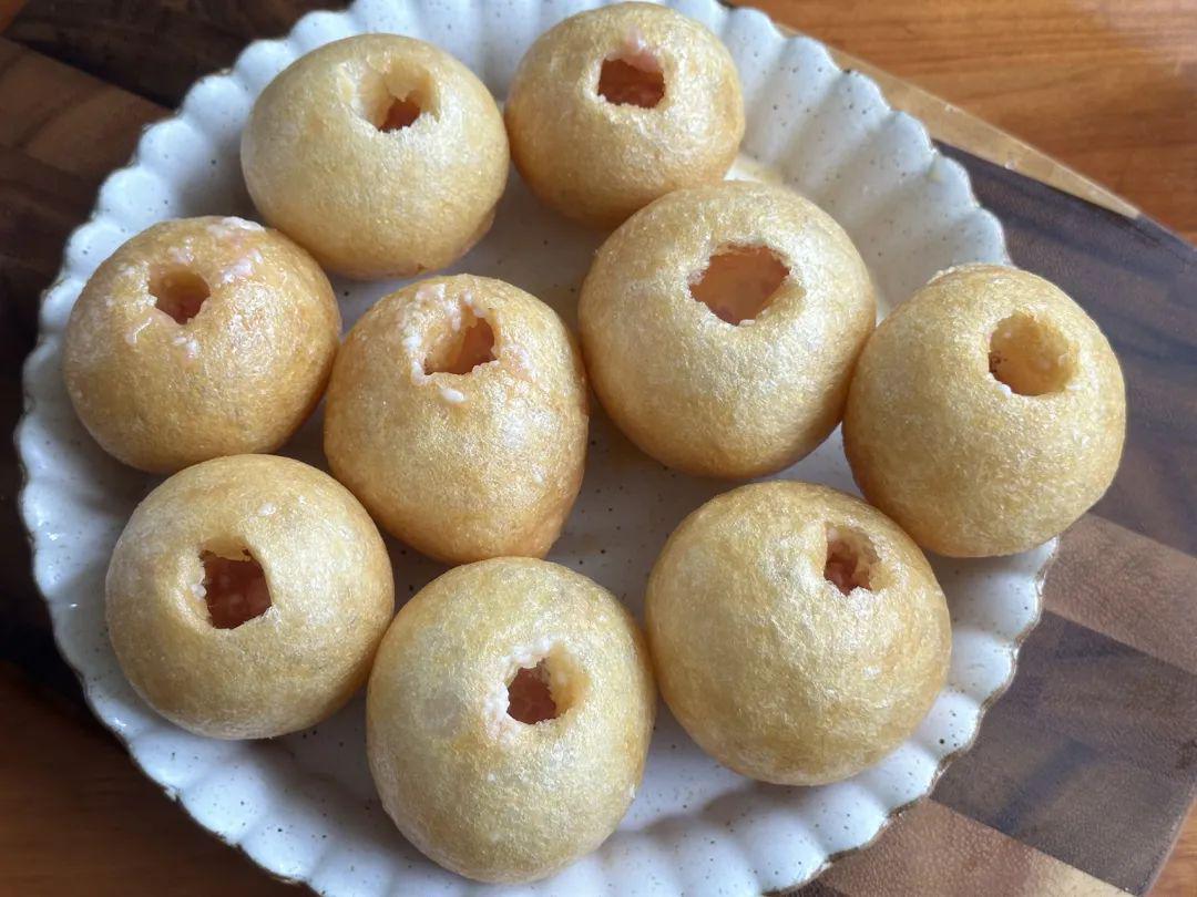 2、准备大概9个油面筋,用手指戳一个洞,收汁在里面转一圈,清空一下里面的面筋,但要注意,不要把皮戳破了。再把蛋液倒在量杯里,灌进油面筋里,中火水开蒸10分钟左右,里面的鸡蛋液凝固就可以;
