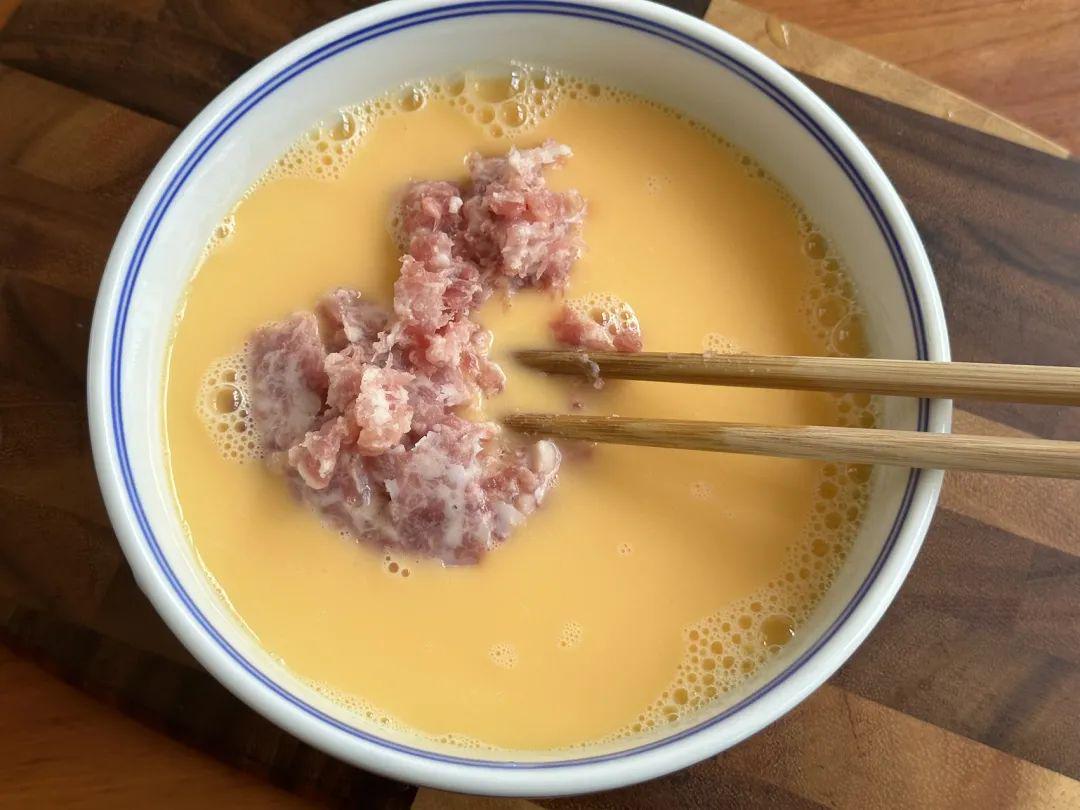 1、3个鸡蛋磕入碗,充分搅散,加入大概100ML左右的清水、少量盐搅拌均匀,再加入大概200克左右的肉末搅拌均匀;