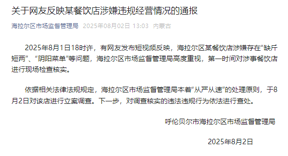 依据相关法律法规规定,海拉尔区市场监督管理局本着“从严从速”的处理原则,于8月2日对该店进行立案调查。下一步,对调查核实的违法违规行为依法进行查处。