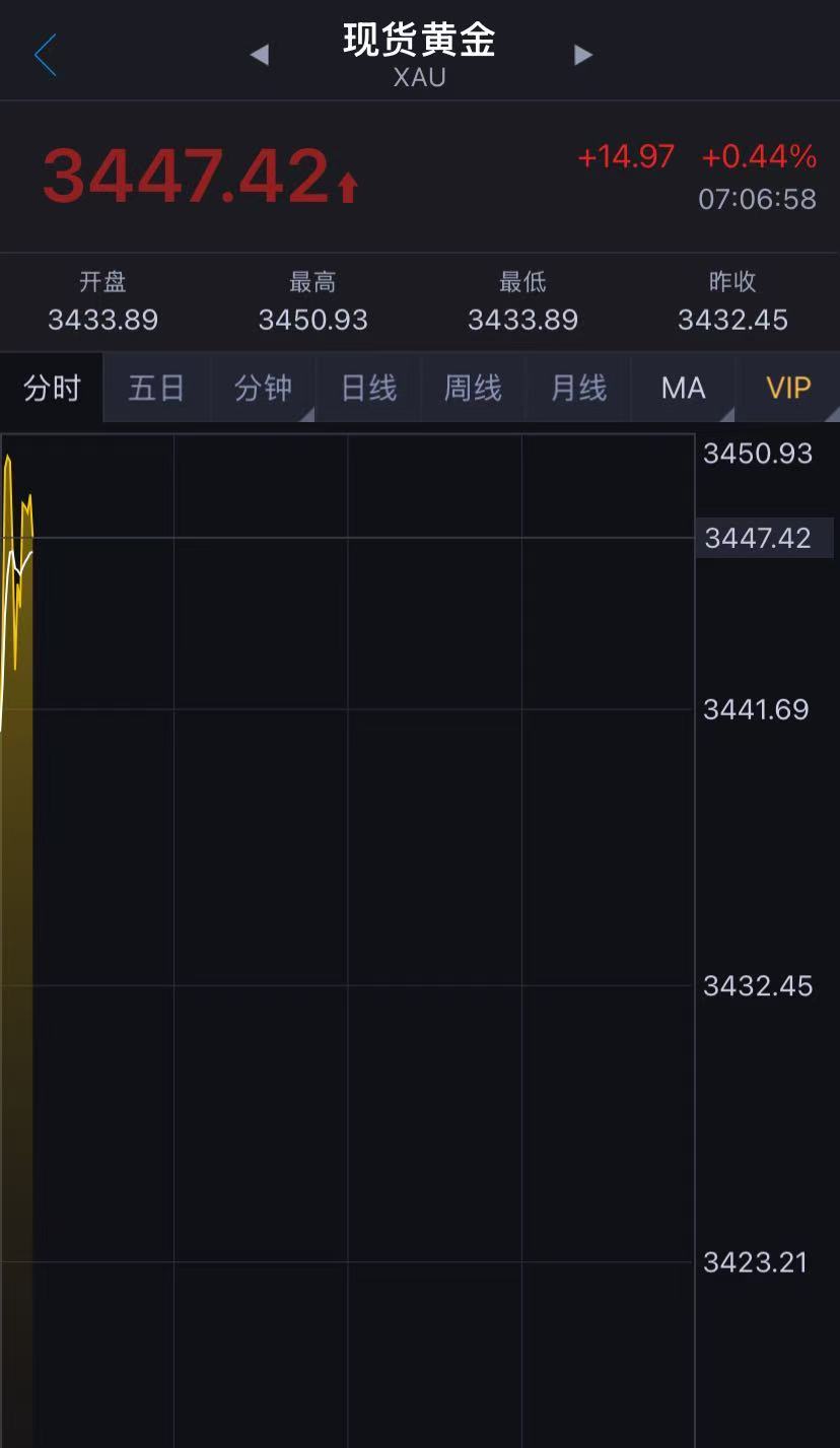 现货黄金周一高开近20美元后快速回调,现报3447.42美元/盎司。