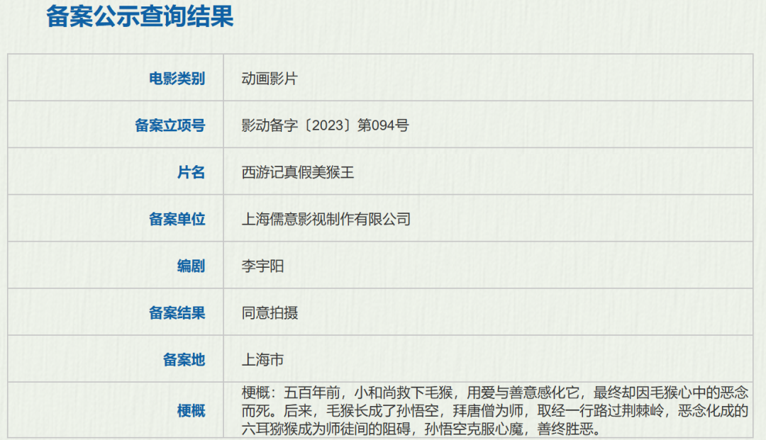 由赵霁、张科执导的动画奇幻电影《西游记真假美猴王》,由上海儒意影视制作有限公司在2023年10月备案。
