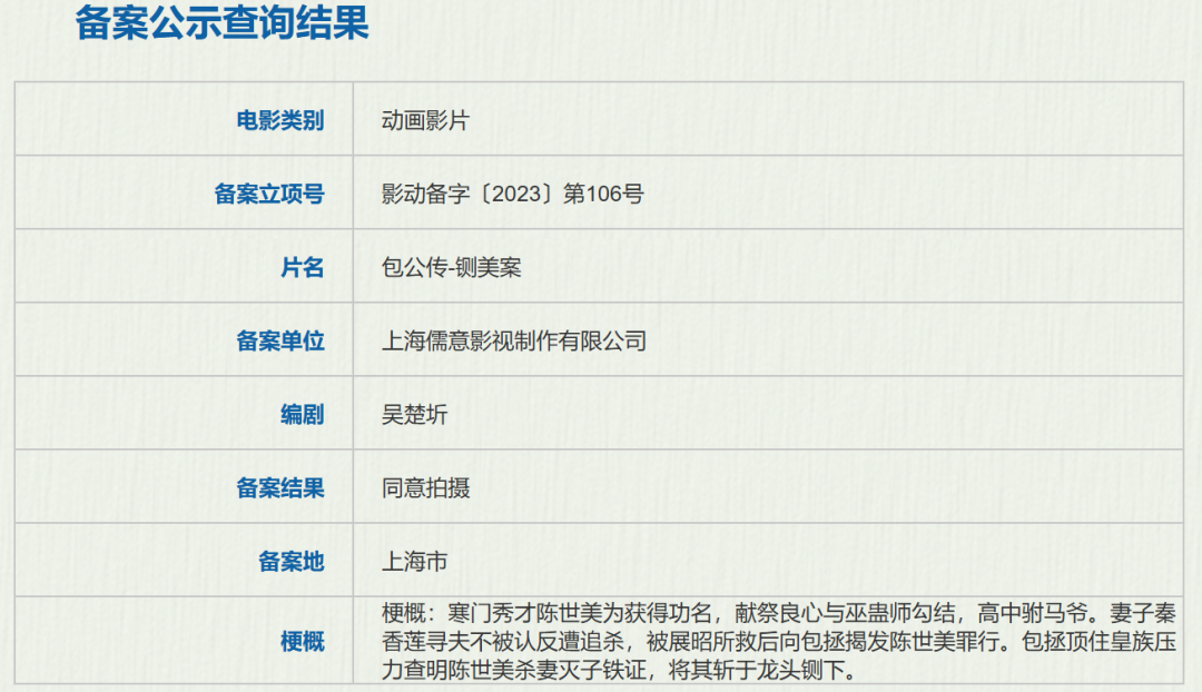 早在2023年12月,上海儒意影视制作有限公司就已经完成了立项备案程序。作品在延续原著包拯铁面无私的人设基础上,又通过动画特有的视觉语言强化了戏剧冲突。